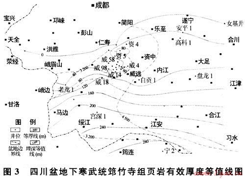 頁巖厚度的確定是頁巖氣資源評價的基礎(chǔ),方法是根據(jù)沉積環(huán)境、巖性特征、結(jié)構(gòu)組成等因素,將目的層中黑色頁巖劃分出來,單獨(dú)進(jìn)行統(tǒng)計(jì)。首先根據(jù)區(qū)域地質(zhì)、地震、鉆井等資料分析四川盆地下寒武統(tǒng)筇竹寺組頁巖系統(tǒng)的區(qū)域展布規(guī)律,確定和劃分頁巖系統(tǒng),對頁巖系統(tǒng)中的黑色頁巖、碳質(zhì)頁巖、黑灰色粉砂質(zhì)和砂質(zhì)頁巖統(tǒng)計(jì)成圖。其次,在此基礎(chǔ)上,依據(jù)有機(jī)碳含量、熱成熟度、鉆井氣顯示等特征,確定有效頁巖厚度(圖3)。四川盆地西南部地區(qū)筇竹寺組有效頁巖面積約55828km2,有效厚度20~300m,盆地南部邊界寧2井區(qū)厚度最大(約450m)。為便于頁巖氣資源估算后的進(jìn)一步經(jīng)濟(jì)評價,對不同埋深下的有效頁巖面積做了統(tǒng)計(jì),埋深大于4500m的有效頁巖面積為27425km2,埋深4500~3200m的有效頁巖面積20684.2km2;埋深小于3200m的有效頁巖面積7718.8km2。