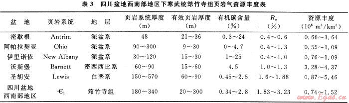為確定四川盆地西南部地區(qū)下寒武統(tǒng)筇竹寺組頁巖氣資源豐度,筆者在威遠(yuǎn)氣田區(qū)實(shí)施了1口鉆井密閉取心,并對其進(jìn)行巖心吸附氣含量測試。威遠(yuǎn)氣田區(qū)下寒武統(tǒng)筇竹寺組頁巖有機(jī)碳含量為0.34%~2.8%,吸附氣含量0.43~0.86m3/t。需要說明的是根據(jù)區(qū)域地層研究,上述鉆井沒能得到該組中最好的黑色頁巖和碳質(zhì)頁巖段巖心,因此,測得的有機(jī)碳與吸附氣含量僅具有不完全代表性,這一問題有待繼續(xù)研究。將筇竹寺組頁巖特征與美國五大頁巖氣含氣盆地對比(見表3),確定出四川盆地西南部地區(qū)下寒武統(tǒng)筇竹寺組頁巖氣資源豐度為0.74×108~1.52×108m3/km2。