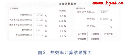 在數(shù)據(jù)記錄操作界面輸入燃料特性參數(shù)(圖1中Cy表示收到基中碳的質(zhì)量分?jǐn)?shù),其他同理)和鍋爐運(yùn)行數(shù)據(jù)(如環(huán)境溫度、排煙溫度、排渣溫度、煙氣組成)等。鍋爐運(yùn)行數(shù)據(jù)輸入可以采用兩種方式:一是與鍋爐現(xiàn)有的數(shù)據(jù)監(jiān)測(cè)采集系統(tǒng)連接,直接獲取相關(guān)數(shù)據(jù),二是在數(shù)據(jù)記錄操作界面人工輸入。數(shù)據(jù)輸入后,單擊“確認(rèn)”按鈕即可計(jì)算出鍋爐各項(xiàng)熱損失率(q2、q3、q4、q5、q6)、過??諝庀禂?shù)(文內(nèi)沒有給出計(jì)算公式)、鍋爐熱效率,見圖2(圖2中預(yù)期值是指鍋爐檢測(cè)報(bào)告中提供的各項(xiàng)熱損失率;“熱效率n”指反平衡熱效率,“熱效率n¢”指正平衡熱效率)。計(jì)算信息將被保存到數(shù)據(jù)庫中,并可以將數(shù)據(jù)上傳,便于日后考察和評(píng)價(jià)鍋爐時(shí)進(jìn)行數(shù)據(jù)查詢。
