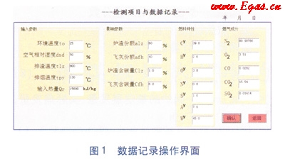 運(yùn)用Matlab軟件對(duì)上述鍋爐熱效率計(jì)算數(shù)學(xué)模型進(jìn)行編程,通過VB軟件進(jìn)行可視化界面顯示,Matlab軟件與VB軟件通過Active X實(shí)現(xiàn)連接,可實(shí)現(xiàn)在線的數(shù)據(jù)傳遞和后臺(tái)的計(jì)算反饋。數(shù)據(jù)記錄操作界面見圖1(受實(shí)際情況限制,圖1中使用的名詞和量符號(hào)與文內(nèi)使用的名詞和量符號(hào)沒有完全對(duì)應(yīng))。