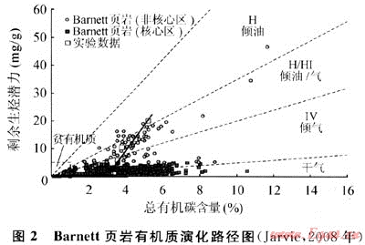 需要注意:初始有機質豐度較高的烴源巖,隨著熱演化程度加深,生烴量增加,殘余有機碳豐度、氫指數(shù)、有機質類型呈現(xiàn)降低、變差趨勢,如Tmax(最大熱解溫度)432℃、等效成熟度0.62%,Barnett頁巖演化至Tmax為470℃,等效成熟度為1.3%時,TOC數(shù)值可降低36%(圖2),對于高成熟和/或過成熟烴源巖,負面影響則更大,所以簡單套用殘余有機碳豐度、氫指數(shù)或于酪根類型判斷頁巖生氣能力的高低可能有失偏頗。但儲集能力而言,殘余有機質豐度??杀碚骱瑲饬看笮。貏e是當兩者呈現(xiàn)正相關情況下。北美頁巖氣勘探目標絕大多數(shù)選擇TOC含量大于2%,甚至4%以上,與此有關聯(lián)。因此資源潛力評價過程中應綜合考量有機質豐度指標,既要重視源巖原始有機質豐度與生烴潛力,又要關注頁巖儲層殘余總有機碳含量的作用。