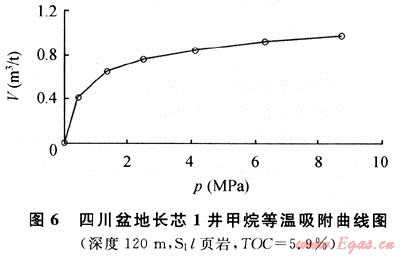 圖6為長芯1井120m處所取巖心的等溫吸附曲線(70℃等溫),該樣品為志留系龍馬溪組黑色頁巖,有機碳含量為5.9%,成熟度為3.26%。在70℃等溫條件下,隨著壓力增高,頁巖吸附甲烷的能力(V)逐漸增大,在壓力達到8.5MPa時,頁巖的甲烷吸附能力達到1m3/t。通過與美國5大頁巖氣盆地的頁巖等溫吸附曲線對比可以發(fā)現(xiàn),長芯1井志留系頁巖的吸附能力除與圣胡安盆地白堊系Lewis頁巖相近外,均低于其他盆地的頁巖。究其原因,筆者認為很可能與成熟度有關。目前發(fā)現(xiàn)的進行商業(yè)開發(fā)的美國5大頁巖氣盆地的頁巖,成熟度普遍不高,介于0.4%~1.9%之間。而熱成因的頁巖氣藏,頁巖成熟度較高,大多在1.1%以上,最高不超過3%。四川盆地長芯1井志留系頁巖的成熟度過高,Ro達到了3.26%,已進入過成熟階段,這可能是導致其吸附能力較低的主要原因。另仔細分析可以發(fā)現(xiàn),美國5大頁巖氣盆地中圣胡安盆地白堊系Lewis頁巖的成熟度最高,為1.6%~1.88%,其頁巖的吸附能力則最小。