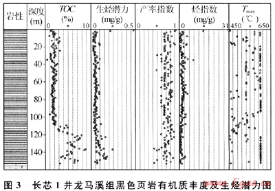 對上揚子地區(qū)下志留統(tǒng)龍馬溪組有機碳含量統(tǒng)計,發(fā)現(xiàn)下志留統(tǒng)龍馬溪組有機碳含量變化大,分布在0.1%~8.65%之間,多數(shù)大于1%。長寧-珙縣地區(qū)鉆探的長芯1井,通過對龍馬溪組下部黑色頁巖153m連續(xù)取心的有機碳含量分析(圖3)同樣反映出這種變化特征。在110m以淺,TOC含量處在1%~3%之間,平均為2%,110~153m井段(龍馬溪組最底部)TOC均大于2%,平均值可達到6%。全井段統(tǒng)計,TOC>2.0%的累計厚度可達80m,主要分布于龍馬溪組下段(包括上奧陶統(tǒng)約10m的五峰組碳質頁巖),這將是形成頁巖氣藏最有利層段。