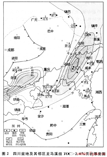 圖2是四川盆地及其鄰區(qū)下志留統(tǒng)龍馬溪組TOC>2.0%的黑色頁巖累計厚度分布圖。由圖2可見,龍馬溪組TOC>2.0%高值區(qū)分布于川東石柱-鄂西利川,黑色頁巖厚達100m,川北鎮(zhèn)巴黑色頁巖厚20m,川南瀘州一帶厚60~80m。3個高值區(qū)的分布在地質上和川東-鄂西深水陸棚沉積相帶、川北深水陸棚沉積相帶以及川南深水陸棚沉積相帶分布相吻合。