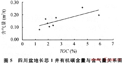 頁巖氣的勘探生產價值取決于其中游離氣和吸附氣的含量,游離氣的含量高低與其構造保存條件密切相關,而吸附氣含量受溫度、壓力等環(huán)境因素影響,在相同情況下,吸附氣量高低與有機質含量呈正相關。上揚子地區(qū)志留系烴源巖有機質豐度高,預計將會在構造保存條件差異較大的地區(qū)分別形成不同含氣量及含氣特點的頁巖氣聚集。在四川盆地,除已發(fā)現(xiàn)過去的老井在鉆探志留系頁巖段時具有豐富的氣顯示之外,目前完鉆的長芯1井初步分析結果顯示,在埋深淺于150 122龍馬溪組頁巖層段內,同樣發(fā)現(xiàn)了頁巖氣存在的證據(jù)(表2)。8個頁巖巖心的含氣量實驗結果顯示(解析溫度70℃),每噸巖石含氣量為0.08~0.25m3,平均為0.15m3/t。另從110m和120m巖樣的甲烷碳同位素分別為-40.2‰和-52.3‰來看,頁巖氣應為熱成因的天然氣。有機質豐度與含氣量的關系則顯示(圖5),同美國頁巖一樣,同樣具有有機碳含量與含氣量呈正相關的關系,即有機質豐度越高,含氣量越大。