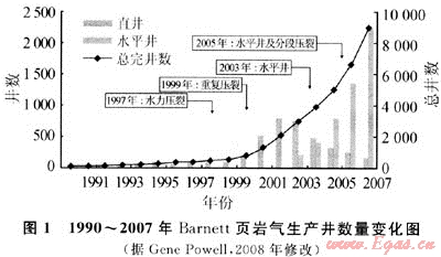 開(kāi)發(fā)技術(shù)的創(chuàng)新尤其是水平井鉆井、壓裂技術(shù)以及裂縫綜合診斷技術(shù)的進(jìn)步與廣泛運(yùn)用在推動(dòng)沃斯堡盆地Barnett頁(yè)巖氣藏的快速發(fā)展中起著至關(guān)重要的作用。1981年,Barnett頁(yè)巖區(qū)在按計(jì)劃鉆探過(guò)程中偶然發(fā)現(xiàn)顯示良好的Barnett頁(yè)巖層段。自1981年第一口發(fā)現(xiàn)井到1992年歷經(jīng)10a生產(chǎn)井僅99口,開(kāi)發(fā)緩慢。1997年后,水力壓裂開(kāi)始取代凝膠壓裂成為頁(yè)巖氣主要的增產(chǎn)措施,Barnett頁(yè)巖氣的開(kāi)發(fā)也隨之加快了前進(jìn)的步伐。隨著1999年重復(fù)壓裂、2003年水平鉆井以及2005年水平井分段壓裂等一系列新技術(shù)的廣泛運(yùn)用,Barnett頁(yè)巖氣發(fā)展速度驚人(圖2),從1997~2007年的10a時(shí)間里,Barnett頁(yè)巖氣區(qū)有多達(dá)8629口頁(yè)巖氣井投入生產(chǎn)(其中水平井4973口,占50%以上)。新技術(shù)的運(yùn)用同樣使Barnett頁(yè)巖氣產(chǎn)量發(fā)生了翻天覆地的變化,截至2008年1月,Barnett頁(yè)巖氣產(chǎn)量約0.996×108m3/d,累計(jì)產(chǎn)量1044.9×108m3[3]。