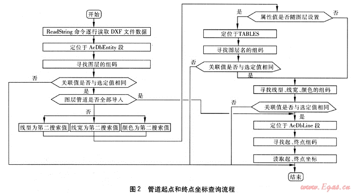 圖2為管道的起點(diǎn)和終點(diǎn)坐標(biāo)的查詢流程圖。程序首先打開儲(chǔ)存管網(wǎng)信息的DXF文件,調(diào)用VC的ReadString命令逐行讀取管網(wǎng)數(shù)據(jù)。當(dāng)查詢到儲(chǔ)存線段信息的AcDbEntity段,找到線段的圖層名組碼,如果組碼的關(guān)聯(lián)值與導(dǎo)入管網(wǎng)簡(jiǎn)圖命令對(duì)話框的選定值相同,接著判斷此圖層中線段是否全部導(dǎo)入,如果全部導(dǎo)入,定位于AcDbEntity段下的AcDbLine子段,讀取線段的起點(diǎn)和終點(diǎn)坐標(biāo);如果還需要根據(jù)圖層中線段的屬性信息進(jìn)一步進(jìn)行篩選,則首先需要判斷是根據(jù)線段的顏色、線型、線寬3個(gè)屬性中哪個(gè)屬性進(jìn)行選擇。例如選擇的是顏色屬性,首先判斷線段的顏色是否隨圖層設(shè)置,如果隨圖層設(shè)置,在TABLES段中,尋找圖層名的組碼,確定組碼的關(guān)聯(lián)值與選定值相同的圖層,接著尋找此圖層名下線段的顏色的組碼,如果組碼的關(guān)聯(lián)值與選定值相同,在AcDbLine段中找到此線段,然后讀取起點(diǎn)和終點(diǎn)坐標(biāo);如果線段的顏色不隨圖層設(shè)置,則直接在AcDbLine段中根據(jù)管道顏色找到該線段的起點(diǎn)和終點(diǎn)坐標(biāo)即可[6~7]。