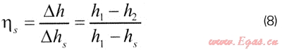 在透平膨脹機(jī)中,標(biāo)志能量轉(zhuǎn)換過(guò)程完善程度的指標(biāo)就是效率。從理論上來(lái)說(shuō),膨脹工質(zhì)在給定的進(jìn)、出口條件下可能實(shí)現(xiàn)的最大比焓降應(yīng)為等熵比焓降△hs,因此等熵比焓降是一個(gè)比較的標(biāo)準(zhǔn)。透平膨脹機(jī)進(jìn)、出口實(shí)際比焓降△h與等熵比焓降之比稱為等熵效率[14]: