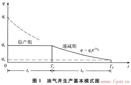 油氣井開采一般都要求有一段時(shí)間的穩(wěn)產(chǎn)期(Te),然后再進(jìn)入遞減階段生產(chǎn)(圖1),而穩(wěn)產(chǎn)期的平均日產(chǎn)量(qe),就是本文所指的儲(chǔ)量起算標(biāo)準(zhǔn)產(chǎn)量。