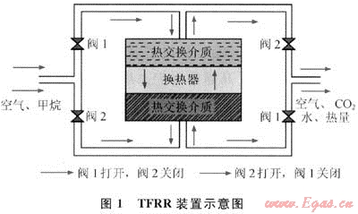 開(kāi)始運(yùn)行時(shí),電熱元件對(duì)熱交換介質(zhì)進(jìn)行預(yù)熱,使之達(dá)到反應(yīng)所需要的溫度。一個(gè)循環(huán)包括兩次風(fēng)流轉(zhuǎn)向,每一次轉(zhuǎn)向稱為一個(gè)半循環(huán)。在第一個(gè)半循環(huán)中,甲烷和空氣的混合物以常溫通入反應(yīng)器,閥1打開(kāi),閥2關(guān)閉,風(fēng)流從反應(yīng)器頂部流向底部,當(dāng)空氣和甲烷的混合物到達(dá)熱交換介質(zhì)時(shí)發(fā)生氧化反應(yīng),放出熱量。產(chǎn)生的熱量及反應(yīng)產(chǎn)物持續(xù)通過(guò)反應(yīng)器的出口,出口處的熱交換介質(zhì)不斷吸熱,從而溫度不斷升高。而入風(fēng)側(cè)因風(fēng)流以常溫通過(guò),熱交換介質(zhì)不斷被冷卻,當(dāng)冷卻到一定溫度時(shí),反應(yīng)器自動(dòng)轉(zhuǎn)換風(fēng)流方向,進(jìn)入第二個(gè)半循環(huán)。風(fēng)流從高溫側(cè)進(jìn)入,并吸收熱交換介質(zhì)的熱量,從而達(dá)到自燃溫度。反應(yīng)生成的熱量,一部分被熱交換器吸收,另一部分用于補(bǔ)償熱損失,從而往復(fù)循環(huán)。
