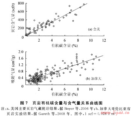 2) 有機(jī)碳含量愈高,氣藏富集程度愈高。商業(yè)性頁巖氣藏需要達(dá)到頁巖有機(jī)碳含量最低界限標(biāo)準(zhǔn)。斯倫貝謝公司對北美頁巖氣盆地的研究認(rèn)為,頁巖氣藏的有機(jī)碳含量最低標(biāo)準(zhǔn)原則上應(yīng)大于2.0%(表4)。因此,有機(jī)碳含量是頁巖氣藏評價(jià)中的一個(gè)重要指標(biāo),它既是頁巖生氣的物質(zhì)基礎(chǔ),決定頁巖的生烴強(qiáng)度,也是頁巖吸附氣的載體之一,決定頁巖的吸附氣大小,還是頁巖孔隙空間增加的重要因素之一,決定頁巖新增游離氣的能力。在相同的地質(zhì)條件及演化階段下,頁巖生烴強(qiáng)度、吸附氣量大小及新增游離氣能力與頁巖中有機(jī)碳含量呈明顯的線性正相關(guān)性。實(shí)驗(yàn)分析結(jié)果表明,頁巖含氣量(吸附氣及游離氣總量)隨頁巖有機(jī)碳含量的增加而增大(圖7-a)。對加拿大哥倫比亞省下白堊統(tǒng)BuckingHorse組202塊頁巖樣品的等溫吸附實(shí)驗(yàn)結(jié)果也同樣表明[7],頁巖有機(jī)碳含量與甲烷吸附量之間呈正相關(guān)分布(圖7-b)。此外,不同母質(zhì)類型、不同演化程度的頁巖,其等溫吸附曲線也存在明顯差別。頁巖有機(jī)質(zhì)類型越好,甲烷的吸附量越大[7]。但與此同時(shí),圖6、圖7中也存在一些異?,F(xiàn)象,說明頁巖含氣量大小不僅僅受有機(jī)碳含量的影響,還可能受其他多種因素的影響,如黏土成分及含量、有機(jī)質(zhì)熱成熟度、頁巖含水量等。對此,尚需作進(jìn)一步的深入研究。