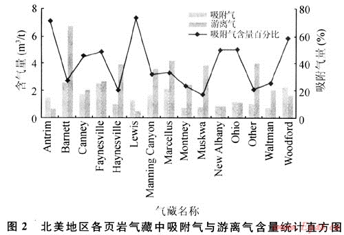 圖2為美國頁巖氣藏中的氣體組成統(tǒng)計(jì)結(jié)果,表明不同地質(zhì)條件下形成的頁巖氣藏其吸附氣與游離氣的含量存在較大差別。頁巖氣藏中吸附氣含量比例較高,變化范圍較大。頁巖含氣量最高的(如Barnett頁巖氣藏)可達(dá)10m3/t,最低(如New Albany頁巖氣藏)僅有1.1m3/t,含氣量平均為3.81m3/t。其中,吸附氣含量最低為16%,最高達(dá)80%。吸附氣含量的變化主要受巖石組成、有機(jī)質(zhì)含量、地層壓力、裂縫發(fā)育程度等因素影響,詳見后述。