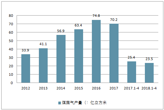 2017 年我國(guó)共實(shí)現(xiàn)煤層氣產(chǎn)量 70.2 億立方米, 2012-2017年年均復(fù)合增長(zhǎng)率為 15.7%,同時(shí)今年前四個(gè)月累計(jì)產(chǎn)量為 23.5 億立方米,同比增速為 8%(可能由于統(tǒng)計(jì)口徑問題,實(shí)際數(shù)據(jù)較 2017 年略有下降)。
