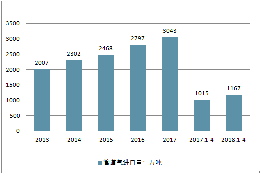 2017 年全年我國(guó)共進(jìn)口管道氣3043 萬噸(約合 408 億立方米)。