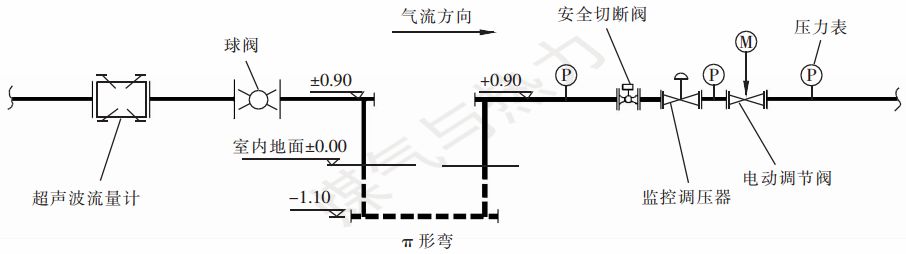 對于電動調(diào)節(jié)閥與超聲波流量計串聯(lián)設置對后者的干擾問題,結(jié)合國內(nèi)外先進經(jīng)驗和作者團隊的深入研究,本站采用π形彎的方式進行降噪,即利用4個三通拼接成一個π形[3]。在不同的方案中,可根據(jù)現(xiàn)場條件、場地大小形狀及檢修通道的布置來考慮π形彎是以平行還是垂直于地面的方式布置。π形彎布置[3]見圖1。