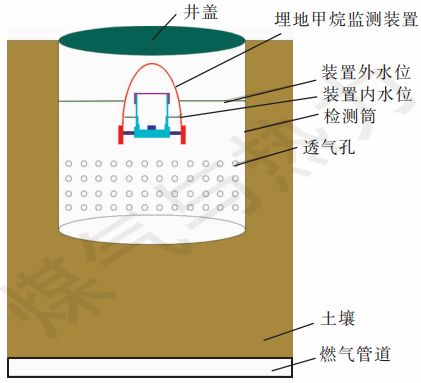 將埋地甲烷監(jiān)測裝置安裝在一個具有承壓及透氣功能的檢測筒內(nèi),檢測筒下方敞口,并與土壤接觸,內(nèi)部無土壤,檢測筒四周打孔,上方設(shè)置井蓋,井蓋與甲烷監(jiān)測裝置采用剛性連接,使得甲烷監(jiān)測裝置固定于檢測筒內(nèi),工作人員可以隨時對檢測筒內(nèi)的甲烷監(jiān)測裝置的傳感器及電池進行校準及更換。檢測筒安裝在管道正上方。參考目前的燃氣管道泄漏點定位打孔深度為0.5 m,因此,燃氣檢測筒的通常高度為0.5 m,可根據(jù)管道埋深增加檢測筒高度。甲烷監(jiān)測裝置及檢測筒的布置見圖1。