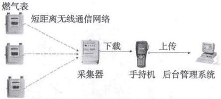 無(wú)線燃?xì)獗硗ㄟ^(guò)自身攜帶的無(wú)線通信模塊與采集器實(shí)現(xiàn)無(wú)線通信,采集器定期主動(dòng)采集燃?xì)獗淼臄?shù)據(jù)并儲(chǔ)存,工作人員通過(guò)手持機(jī)與采集器通信將表中的數(shù)據(jù)下載到手持機(jī)中。此種抄表系統(tǒng)中的通信方式均為短距離通訊網(wǎng)絡(luò)。該技術(shù)僅僅將有線抄表技術(shù)更換成無(wú)線通訊,依然需要工作人員定期將數(shù)據(jù)下載到手持機(jī)中,比較落后。