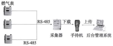 有線抄表系統(tǒng)主要由燃?xì)獗怼⒉杉骱褪殖謾C(jī)構(gòu)成,其原理如圖2所示。燃?xì)獗硗ㄟ^(guò)通信總線與采集器相連,采集器定期采集燃?xì)獗頂?shù)據(jù)并存儲(chǔ)于芯片中。工作人員通過(guò)手持機(jī)讀取采集器中所存儲(chǔ)的燃?xì)獗頂?shù)據(jù)并將其上傳到燃?xì)馄髽I(yè)后臺(tái)管理系統(tǒng)。