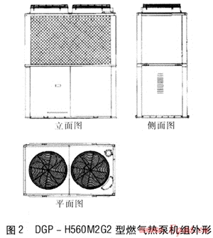 該公司燃?xì)鉄岜每照{(diào)制冷系統(tǒng)見圖1。根據(jù)該公司基本情況,選用DGP-H560M2G2型燃?xì)鉄岜脵C(jī)組,安裝在屋頂,該機(jī)組長為1.800m,寬為1.060m,高為2.248m,質(zhì)量為840kg。該型號(hào)燃?xì)鉄岜脵C(jī)組的技術(shù)參數(shù)見表1,其外形見圖2。
