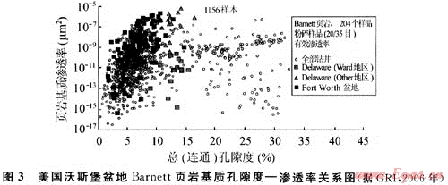 4) 頁巖氣藏儲層具典型的低孔低滲物性特征,頁巖產(chǎn)層厚度一般為15~100m,孔隙度一般為4%~6%,滲透率小于0.001×10-3μm2(見圖3)。處于斷裂帶或裂縫發(fā)育帶的頁巖儲層滲透率可以增加,孔隙度最高可達11%,滲透率可達1×10-3μm2左右[1]。據(jù)美國主要頁巖氣產(chǎn)層儲層物性統(tǒng)計,孔隙度為4.22%~6.51%,滲透率為40.9×10-6μm2。