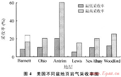 據(jù)美國5個主要頁巖氣產(chǎn)氣盆地的統(tǒng)計,頁巖氣藏的采收率變化范圍為5%~60%(見圖4)。如埋藏較淺、地層壓力較低、有機質(zhì)豐度較高、吸附氣含量較高的Antrim頁巖氣藏的采收率可達60%;而埋藏較深、地層壓力較高、吸附氣所占比例相對較低的Barnett頁巖氣藏的采收率早期為7%~8%,隨著水平井和壓裂技術(shù)的進步,目前的采收率達到16%,預(yù)計最終可達25%左右。