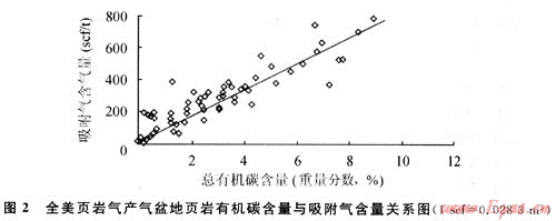 2) 頁巖氣主要由吸附氣和游離氣兩部分組成。其中基質(zhì)孔隙和裂縫中的游離氣的儲集方式與常規(guī)天然氣儲層相似;有機質(zhì)與黏土顆粒表面的吸附氣的儲集方式與煤層氣相似。不同地質(zhì)條件下游離氣與吸附氣的相對比例有很大差別[2]。影響游離氣量大小的主要因素是頁巖基質(zhì)孔隙的大小和天然裂縫的發(fā)育程度,二者為正相關(guān)關(guān)系;影響吸附氣多寡的關(guān)鍵因素是有機碳含量的高低,二者同樣具正相關(guān)性(見圖2)。