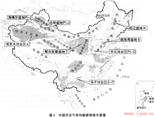 我國中、新生界陸相沉積尤其發(fā)育,并已被勘探開發(fā)實踐證實其中的絕大部分富有機質(zhì)泥頁巖為含油氣盆地中的優(yōu)質(zhì)烴源巖,如松遼盆地下白堊統(tǒng)的青山口組黑色泥頁巖、渤海灣盆地古近系沙河街組的泥頁巖、鄂爾多斯盆地上三疊統(tǒng)延長組的張家灘(T3yc3)、李家畔(T3yc2)頁巖等。前人研究表明,中國北方陸相泥頁巖烴源巖母質(zhì)來源以浮游生物、細(xì)菌、高等植物為主,具有多種干酪根類型,TOC平均為2%~3%,最高可達8%,埋深2000~3000m,Ro為0.8%~1.2%,處于液態(tài)烴與氣態(tài)烴并重階段。其中在我國中西部地區(qū)的晚石炭世-二疊紀(jì)、晚三疊世-早中侏羅世還發(fā)育兩期煤系沉積,分布廣泛,天然氣資源豐富,煤層氣資源量約16.5×1012m3。對中-下侏羅統(tǒng)煤系沉積進行研究,發(fā)現(xiàn)中-下侏羅統(tǒng)煤系中廣泛發(fā)育高碳泥頁巖,厚度為40~100m,TOC為20%~30%,Ro為0.8%~1.2%,母質(zhì)類型為腐殖型,是一套頁巖氣藏形成的有利目的層系。綜合多種地質(zhì)條件,認(rèn)為松遼盆地白堊系頁巖,準(zhǔn)噶爾盆地南緣上二疊統(tǒng)、中-下侏羅統(tǒng)頁巖,陜甘寧盆地上三疊統(tǒng)頁巖以及吐哈盆地中-下侏羅統(tǒng)碳質(zhì)頁巖是有利的頁巖氣形成層系和地區(qū)。