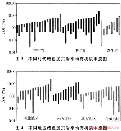 古生界、中生界分布范圍較廣并大致以天山為中心形成南、北“蹺蹺板”式沉積特點,即早古生代時以天山以南的塔里木地塊為沉降沉積中心,形成較大面積分布的海相頁巖。晚古生代時則以天山以北的準(zhǔn)噶爾地塊為中心形成頁巖沉積。晚二疊紀(jì)末中生代以來,全區(qū)進(jìn)入陸相沉積環(huán)境,“蹺蹺板”運動基本結(jié)束,總體上表現(xiàn)出總有機(jī)碳含量向上逐漸增加的趨勢。