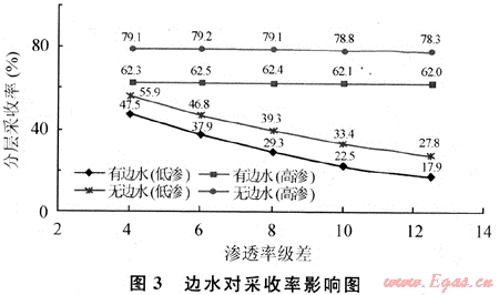 根據(jù)澀北氣田水體能量,水體體積大小為20倍烴類體積,日產(chǎn)氣量2×104m3。應(yīng)用數(shù)值模擬單井模型,邊水采用網(wǎng)格水體,模擬表明:滲透率級差越大,儲量動用程度越低,邊水對采收率影響越大。多層合采開發(fā),邊水對高滲層影響大,由圖3可以看出高滲層的分層采收率,存在邊水條件下比定容氣藏減少16.3%~16.9%,低滲層則只減少8.4%~10.8%。模擬表明:高滲儲層壓力下降速度明顯高于低滲層,邊水突破后嚴(yán)重影響低滲層儲量動用。