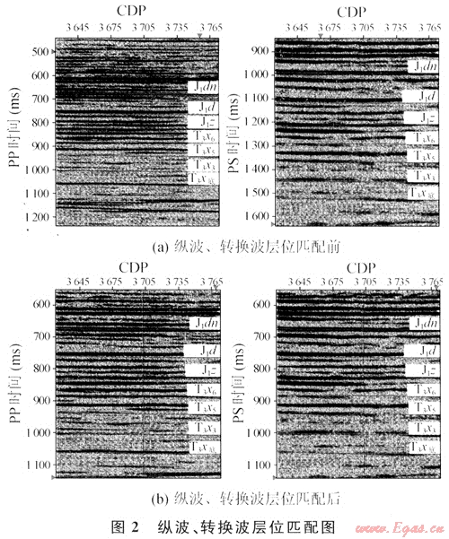 在井旁標(biāo)定層位后,就可以展開整個(gè)剖面的對(duì)比工作,這與常規(guī)解釋相同。層位解釋完成后,需要做多波解釋的特殊解釋工作——層位匹配。由于縱波、橫波在同一地層介質(zhì)中的傳播速度不同,因此同一反射在時(shí)間剖面上縱波和轉(zhuǎn)換波的時(shí)間有很大差異,為了更好對(duì)縱波、轉(zhuǎn)換波進(jìn)行聯(lián)合地質(zhì)目標(biāo)體解釋,須對(duì)縱波橫波進(jìn)行層位匹配。層位匹配是對(duì)縱、橫波地震響應(yīng)較為系統(tǒng)的一個(gè)認(rèn)識(shí)過程。圖2是縱波、轉(zhuǎn)換波層位匹配前后的時(shí)間剖面,可以看出,經(jīng)匹配后縱波、轉(zhuǎn)換波層位得以一一對(duì)應(yīng)。