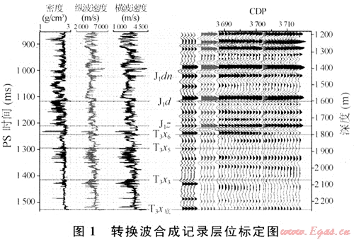 多波解釋首當(dāng)其沖的問題便是轉(zhuǎn)換波的地質(zhì)層位標(biāo)定。它是多分量解釋最為關(guān)鍵的一環(huán),也是國內(nèi)外公認(rèn)的一個(gè)難點(diǎn)。圖1是利用GeoMountain解釋工程師軟件在縱波地質(zhì)層位標(biāo)定的基礎(chǔ)上對(duì)GA2井進(jìn)行轉(zhuǎn)換波合成記錄地質(zhì)層位的標(biāo)定結(jié)果。