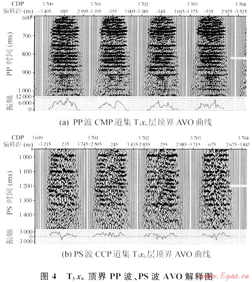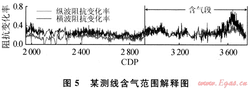 通過匹配的PP波和PS波剖面就得到了目的層段的PP波和PS波旅行時(shí)的對(duì)應(yīng)關(guān)系,這是進(jìn)行多波聯(lián)合反演的重要基礎(chǔ)。完成多波層位匹配方可進(jìn)行多波聯(lián)合反演。多波聯(lián)合反演采用目的層位的PP波和PS波AVO效應(yīng)來求取目的層位的彈性參數(shù)信息。因此首先拾取出目的層的AVO曲線(圖4)。為了將AVO曲線轉(zhuǎn)換為AVA曲線,利用PP波和PS波速度譜建立PP波和PS波的速度場(chǎng),對(duì)速度比進(jìn)行估計(jì)。經(jīng)AVO正演方法對(duì)地震數(shù)據(jù)能量進(jìn)行調(diào)整,最后由目的層頂界面PP波和PS波的AVO曲線反演了蓋層與儲(chǔ)層的縱波和橫波的阻抗變化率(圖5)。綜合工區(qū)井資料、地質(zhì)資料進(jìn)行分析,再由橫向上的阻抗變化率圖可見,在CDP2890附近特征明顯變化,左邊的阻抗變化率低于右邊的,但提高變化率較為明顯反映了目標(biāo)儲(chǔ)層的含氣范圍,為此套儲(chǔ)層的開發(fā)提供了依據(jù)。