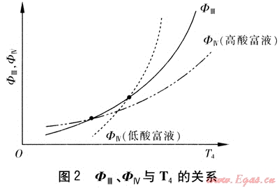 上式中T4按ФⅢ、ФⅣ方程擬合曲線求交點的方法求取,ФⅢ、ФⅣ與死的關(guān)系見圖2。若所求交點溫度乃滿足熱平衡方程ФⅢ=ФⅣ,則T4即為填料層頂溫度。