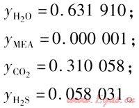 按MEA對CO2、H2S化學(xué)平衡吸收數(shù)據(jù)計算吸收量,再以填料最小濕潤率要求作校核計算,取其大者。最后以Maddox平均數(shù)據(jù)計算貧液中CO2、H2S殘留量,最終可得富液各組分流量及組成。H2O、MEA、CO2、H2S的流量分別為329.329、17.140、2.452、0.175kmol/h,其摩爾分數(shù)分別為0.943377、0.049099、0.007023、0.000501。