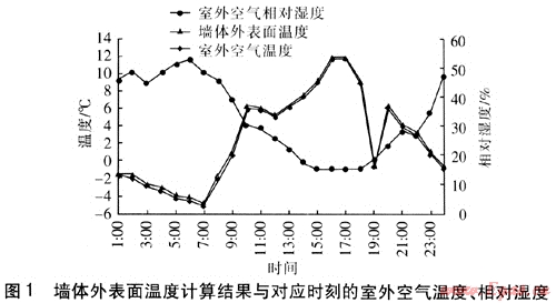 為了對太陽輻射條件下墻體外表面向內(nèi)側(cè)的傳熱量進行分析,選定墻體結(jié)構(gòu)及材料熱工性能參數(shù)見表1,熱工性能參數(shù)滿足DB 63/643—2007《青海省居住建筑節(jié)能設(shè)計標準》。墻體外表面為淺色涂料,建筑物四周為綠色草坪。墻體外表面溫度采用有限差分法進行計算,并采用ANSYS計算軟件對結(jié)果進行校核。墻體外表面溫度計算結(jié)果與對應時刻的室外空氣溫度、相對濕度見圖1。