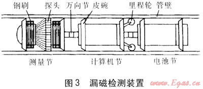 漏磁檢測裝置由釹鐵硼永久磁鐵勵磁,采用霍爾效應(yīng)傳感器檢測磁場。該裝置自帶電源,隨傳輸介質(zhì)運行,數(shù)據(jù)存儲在硬盤中。完成檢測后,經(jīng)評價軟件處理得到缺陷尺寸及所在位置,為管道安全評價、壽命預(yù)測、管道維護提供技術(shù)支持。為保證裝置順利通過彎頭,裝置分為測量節(jié)、計算機節(jié)和電池節(jié)3節(jié),節(jié)間采用軟連接,漏磁檢測裝置見圖3。