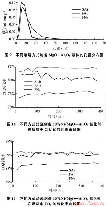 圖10、圖11為不同方式焙燒MgO-Al203載體制備10%Ni/ MgO-Al203催化劑在反應(yīng)中CH4和CO2的轉(zhuǎn)化率。從圖10、11中可以看出,流動空氣條件下焙燒載體催化劑的催化活性較好,CH4和CO2的轉(zhuǎn)化率分別可以達到82%和92%左右,隨著反應(yīng)的進行,流動空氣焙燒催化劑的催化活性一直較為穩(wěn)定,表明催化劑的穩(wěn)定性較好。