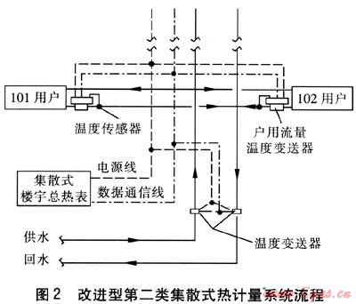 第二類集散式熱計量系統(tǒng)是基于戶用流量溫度變送器的樓宇供暖熱計量系統(tǒng),適合于采用單戶系統(tǒng)(一戶一環(huán))的熱計量。特點為:將各單戶系統(tǒng)的熱量積算功能由集散式樓宇總熱表完成,簡化單戶系統(tǒng)的熱量計量裝置功能,只負責單戶系統(tǒng)的流量和溫度監(jiān)測和變送,成本更低,結構更緊湊,故障減少,維護管理更簡便。