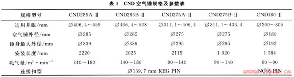 鑒于空氣錘獨特的技術(shù)優(yōu)勢[1~2],中原油田鉆井工程技術(shù)研究院開展了CND型空氣錘的研制,具有結(jié)構(gòu)簡單、故障率低、可靠性高、技術(shù)支持及時等特點,主要技術(shù)性能指標(biāo)處于國內(nèi)領(lǐng)先水平。已完成285A、285B、275A、275B、Φ180mm3種型號5種規(guī)格空氣錘設(shè)計、研制。配套加工Φ444.5mm、Φ406.4mm、Φ320mm、Φ314.3mm、Φ311.1mm、Φ241.3mm、Φ215.9mm7種規(guī)格空氣錘鉆頭。開發(fā)研制了多種形式鉆頭防掉落安全機構(gòu),有效防止鉆頭斷裂入井。獨創(chuàng)設(shè)計了兩種鉆頭保徑齒結(jié)構(gòu)形式,有效降低了鉆頭徑向磨損,提高鉆頭壽命。自主設(shè)計了空氣錘配套工具:高壓定量注油機和液壓鏈鉗[3]。