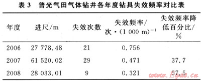 氣體鉆井施工中鉆具斷裂頻率遠高于鉆井液鉆井。鉆具斷裂不僅部分抵消了氣體鉆井技術(shù)的提速效果,而且給井下安全帶來隱患。預(yù)防和減少鉆具斷裂,對于提高井下安全以及推廣應(yīng)用氣體鉆井技術(shù)具有重要意義。對多只斷裂鉆具進行理化性能檢驗、金相分析、掃描電鏡和能譜分析、腐蝕產(chǎn)物XRD分析發(fā)現(xiàn):失效鉆具的化學(xué)成分、金相組織等均符合相關(guān)標(biāo)準;僅個別鉆桿的屈服強度和縱向沖擊功不符合API Spec 5D標(biāo)準;鉆桿為疲勞或腐蝕疲勞斷裂;鉆鋌為典型的疲勞斷裂;鉆具腐蝕類型為氧腐蝕。氣體鉆井鉆具失效的主要原因是[4]:①氧腐蝕和沖蝕。氣體鉆井中,注入氣體中含有約20%的氧氣,若鉆進井段地層出水或進行霧化、泡沫鉆井時,則極易發(fā)生氧腐蝕。②鉆柱反轉(zhuǎn)。鉆具質(zhì)量不平衡、鉆柱轉(zhuǎn)動時產(chǎn)生的離心力以及鉆柱與井壁間的摩擦力是引起鉆柱反轉(zhuǎn)的三要素。反轉(zhuǎn)使鉆具承受高頻高幅交變彎曲應(yīng)力。當(dāng)鉆柱沿井壁作純滾動時,反轉(zhuǎn)速度最高。反轉(zhuǎn)運動對鉆具失效有嚴重影響。氣體鉆井中,鉆柱與井壁間幾乎為干摩擦,因而更容易產(chǎn)生反轉(zhuǎn)運動,這是氣體鉆井比鉆井液鉆井鉆具失效頻率高的原因之一。牙輪鉆頭鉆井所用轉(zhuǎn)盤轉(zhuǎn)速(一般為50~80r/min)比空氣錘鉆井所用轉(zhuǎn)速(一般為15~30r/min)高。因此,牙輪鉆頭鉆井中鉆柱反轉(zhuǎn)運動更劇烈,這是牙輪鉆頭鉆井遠比空氣錘鉆井鉆具失效頻率高的原因之一。③鉆柱縱向振動。鉆柱振動是導(dǎo)致鉆柱疲勞破壞的主要因素,主要包括橫向振動、扭轉(zhuǎn)振動和縱向振動,在直井中以縱向振動為主。牙輪鉆頭鉆硬地層時會引起兩種頻率的縱向振動:因鉆頭輪齒滾動而產(chǎn)生的高頻小位移縱振和因波狀井底引起的低頻大位移縱振。前者對碎巖有利,而后者對鉆具壽命影響很大。造成牙輪鉆井鉆具失效頻率高。④井眼彎曲。當(dāng)井斜較大,存在嚴重狗腿,鉆桿在彎斜井段旋轉(zhuǎn)時,承受交變彎曲應(yīng)力,且狗腿以上井段鉆具斷裂次數(shù)少,狗腿以下井段鉆具斷裂次數(shù)明顯增多。⑤鉆鋌螺紋連接彎曲強度比不足。按照API標(biāo)準,Φ203.2mm、Φ228.6mm鉆鋌應(yīng)分別采用NC56、NC61螺紋,但普光氣田所用的同規(guī)格鉆鋌分別使用Φ168.3mm REG、Φ193.7mm REG螺紋,其BSR遠低于NC56、NC61螺紋?,F(xiàn)場所用鉆鋌螺紋連接彎曲強度比低和牙根應(yīng)力集中程度高,是鉆鋌多在母扣根部而非公扣處斷裂的主要原因。⑥缺乏探傷和精細管理,鉆具的使用時間可能超過了疲勞壽命。提出了氣體鉆井預(yù)防鉆具失效措施,主要包括空氣錘沖旋鉆井技術(shù)、優(yōu)化參數(shù)鉆柱防共振技術(shù)、加強鉆鋌螺紋探傷及選用高質(zhì)量鉆具等。這些技術(shù)的應(yīng)用取得了明顯的效果。鉆具失效頻率逐年降低(表3)。