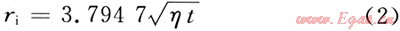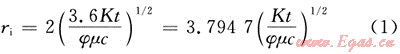 石油工業(yè)中國際上對于探測半徑的定義為:在某一確定的瞬時(shí),給井中施加一個(gè)壓力脈沖,對該脈沖響應(yīng)達(dá)到最大值的位置就稱為探測半徑。在標(biāo)準(zhǔn)單位制式下,探測半徑表示為[1]: