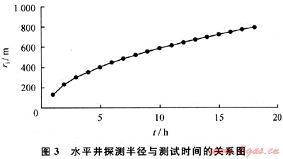 給定水平井段長度為500m,氣層厚度為40m,水平滲透率為0.005μm2,各向異性系數(shù)為2,氣體黏度為0.04mPa·s,孔隙度為10%,綜合壓縮系數(shù)為0.0005MPa-1,測試時(shí)間1~18h。由式(8)得出探測半徑與測試時(shí)間的關(guān)系如圖3所示。從圖3可以看出,探測半徑隨時(shí)間延長上升幅度減小,呈現(xiàn)非線性特征。