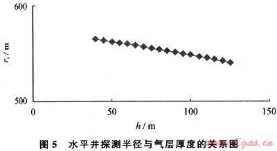 給定氣層厚度40~125m,其他參數(shù)同前,由式(8)得出探測半徑與氣層厚度的關(guān)系(圖5)。可以看出:氣層厚度增大,探測半徑減小,但減小的幅度很小。此即說明滲流截面積越大,壓力波向地層推進(jìn)越慢。