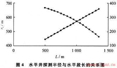 給定水平井段長500~1350m,測試時(shí)間10h,其他參數(shù)同前,由式(8)得出探測半徑與水平段長度的關(guān)系(圖4)??梢钥闯觯簲M圓形坑道外緣半徑隨水平段長的增產(chǎn)而變大,而探測半徑是降低的。