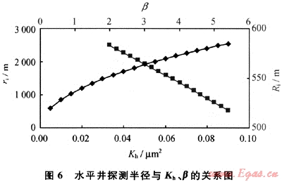 該水平井探測半徑存在一個(gè)基準(zhǔn)值,即水平井測試或生產(chǎn)完成垂直平面內(nèi)的徑向流時(shí)的探測半徑(擬圓形坑道的外緣半徑rpce)以及對應(yīng)的時(shí)間tpce測試或生產(chǎn)時(shí)間大于tpce時(shí)即可進(jìn)行計(jì)算。對于油氣藏儲集空間平面上表現(xiàn)出徑向復(fù)合的非均質(zhì)特征時(shí),可以先對儲層水平滲透率進(jìn)行平均后再進(jìn)行計(jì)算。實(shí)際計(jì)算結(jié)果表明,水平井探測半徑隨測試或生產(chǎn)時(shí)間及儲層滲透率的增大而增大,隨儲層厚度、水平段長度及各向異性系數(shù)的增大而降低。根據(jù)筆者提出的方法,不僅可以實(shí)時(shí)評價(jià)水平井的探測半徑、對油氣藏的控制程度,還可優(yōu)化水平井油藏工程設(shè)計(jì)、評價(jià)水平井開發(fā)的優(yōu)勢。