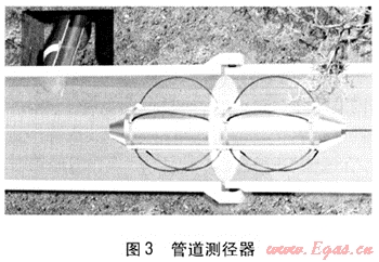 測(cè)徑器檢測(cè)法目前在石油管道、海底管道工程中應(yīng)用較多,而且技術(shù)也比較成熟,但檢測(cè)精度有待提高。另外一類測(cè)徑檢測(cè)法是使用一種類似于清管器的裝置,它利用介質(zhì)推動(dòng)在管道內(nèi)通行,可檢測(cè)管道內(nèi)凹陷、橢圓變形、環(huán)焊縫周長(zhǎng)、壁厚變化等。常通過評(píng)估軟件將管道內(nèi)凹陷或橢圓變形超過一定指標(biāo)的部位及數(shù)據(jù)以列表形式或圖形方式顯示出來(lái)。
