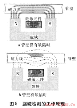 漏磁檢測(cè)技術(shù)建立在鐵磁材料的高磁導(dǎo)率特性之上,其工作原理見圖5。當(dāng)檢測(cè)裝置在管道內(nèi)行走時(shí),通過檢測(cè)器所攜帶的強(qiáng)力永久磁鐵將管道磁化,使管道上產(chǎn)生一個(gè)縱向的磁場(chǎng)回路。當(dāng)管壁無(wú)缺陷時(shí),磁力線絕大部分通過管壁,此時(shí)磁力線均勻分布;當(dāng)管壁有缺陷時(shí),磁力線發(fā)生彎曲,并且有一部分的磁力線穿出管壁以外產(chǎn)生漏磁。通過檢測(cè)和分析逸出管壁的漏磁通量,就可以確定管道金屬損失的程度以及位置。