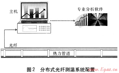 在使用分布式光纖測(cè)溫系統(tǒng)檢測(cè)管溝內(nèi)熱力管道時(shí),可將測(cè)溫光纖傳感器沿?zé)崃艿啦荚O(shè),置于管道保溫層的表面,并每隔一定距離固定。固定時(shí)無(wú)特殊要求,原則是盡量讓測(cè)溫光纖傳感器貼近熱力管道,不要因重力而滑落即可,分布式光纖測(cè)溫系統(tǒng)配置見圖2。當(dāng)熱力管道的管子壁厚變薄、接頭斷裂或保溫層損壞后,會(huì)使得局部管段的溫度異常,測(cè)溫光纖傳感器能及時(shí)捕獲這些異常,反映在監(jiān)測(cè)站內(nèi)的主機(jī)中。通過圖形化的專業(yè)分析軟件,可以分析與提取出異常點(diǎn)的位置及溫度偏差,實(shí)現(xiàn)報(bào)警功能。若今后考慮采用分布式光纖測(cè)溫系統(tǒng)監(jiān)測(cè)直埋熱力管道,建議在熱力管道的下面同時(shí)埋設(shè)一根小直徑的鋼管,內(nèi)置測(cè)溫光纖傳感器,這樣在有供熱介質(zhì)泄漏時(shí)能及時(shí)發(fā)現(xiàn)漏點(diǎn)位置。