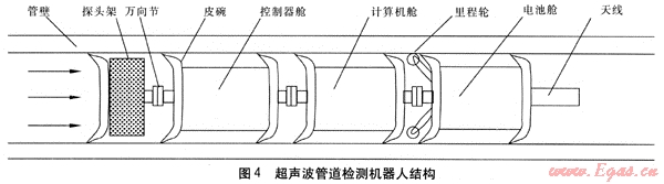 超聲波檢測(cè)法是利用超聲波的脈沖反射原理,通過超聲波在介質(zhì)中傳播時(shí)遇金屬表面發(fā)生部分反射的特性來(lái)測(cè)定管道的壁厚及管內(nèi)表面狀況的一種方法。管道內(nèi)檢測(cè)使用的超聲波檢測(cè)儀為管道內(nèi)通行的檢測(cè)機(jī)器人,超聲波管道檢測(cè)機(jī)器人是一種能夠遠(yuǎn)程控制、在管道內(nèi)行走、裝載有超聲波傳感器件的機(jī)構(gòu)(見圖4)[4]。檢測(cè)機(jī)器人由液體推動(dòng),由多節(jié)功能艙組成。主要包括探頭架、萬(wàn)向節(jié)、皮碗、控制器艙、計(jì)算機(jī)艙、里程輪、電池艙、天線等。探頭架內(nèi)安裝有環(huán)向陣列超聲波檢測(cè)器,是檢測(cè)管道壁厚數(shù)據(jù)的來(lái)源;艙與艙之間以萬(wàn)向節(jié)連接,便于通過管道轉(zhuǎn)彎部分;多個(gè)皮碗實(shí)現(xiàn)檢測(cè)裝置的密封;控制器艙內(nèi)安裝控制整套機(jī)構(gòu)動(dòng)作的執(zhí)行元件;計(jì)算機(jī)艙負(fù)責(zé)接收外部指令并向控制器艙發(fā)送動(dòng)作指令;里程輪用于計(jì)算從管道入口開始行走的距離;電池艙給管道內(nèi)整套檢測(cè)裝置供電;天線負(fù)責(zé)檢測(cè)機(jī)器人與地面控制裝置的通信。