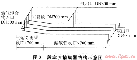 4) 以O(shè)LGA軟件的計(jì)算結(jié)果為依據(jù),根據(jù)本工程的實(shí)際情況和國(guó)際上的經(jīng)驗(yàn),采用指狀管式段塞流捕集器,應(yīng)用國(guó)際先進(jìn)的計(jì)算方法,確定段塞流捕集器的結(jié)構(gòu)與尺寸并自行進(jìn)行機(jī)械設(shè)計(jì)[1]。指狀管段塞流捕集器主要由4根口徑為DN700mm、長(zhǎng)度為70m的并聯(lián)管道構(gòu)成(圖3),可捕集的混輸干線最大液塞長(zhǎng)度為500m。